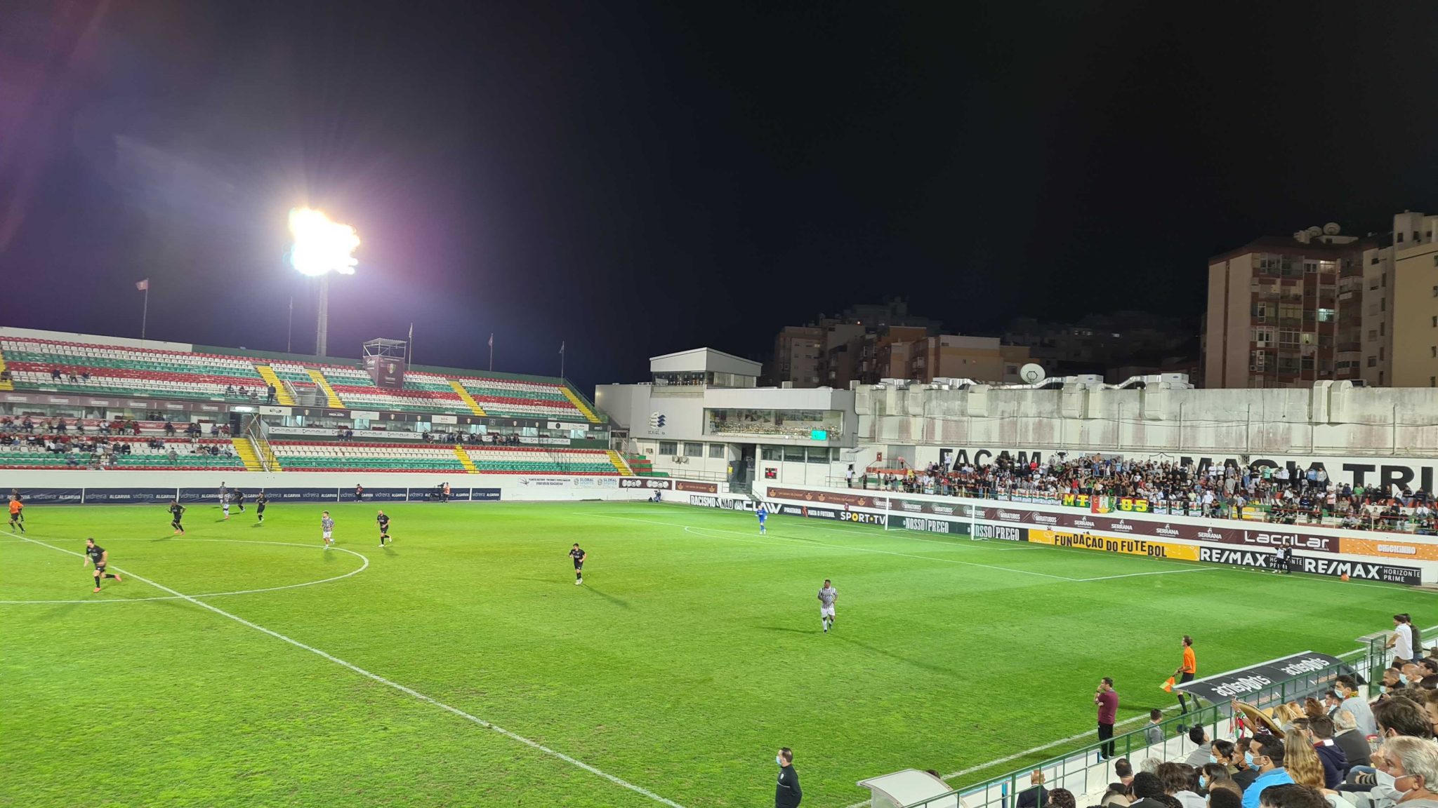In der Vorstadt-Plattenbau-Idylle haben die Fans wie meist in Portugal die Angewohnheit erst knapp zum Anpfiff oder kurz nach Spielbeginn im Stadion zu sein. Das letzte Sagres vor dem Kiosk noch gemütlich zu Ende zu schlürfen, fällt einigen Stadionbesuchern heute jedoch vor die Füße. Der Liga-Neuling erlebt einen furiosen Start und hat nach 9 Minuten bereits dreimal eingenetzt. Und auch nach dem vierten Tor in der zwölften Minute füllt sich die Gegentribüne weiterhin stetig. „Olá, schon was passiert?“.