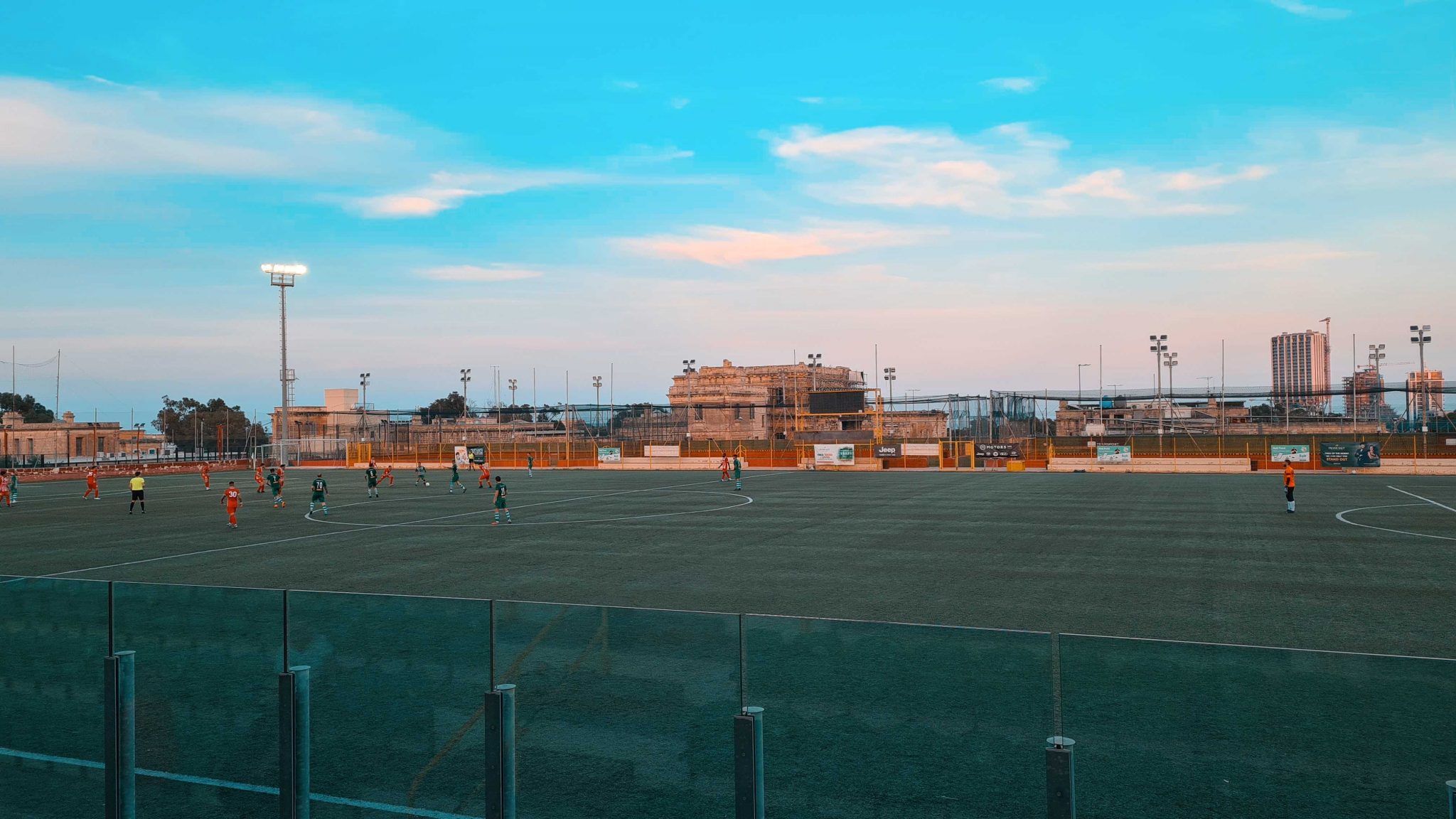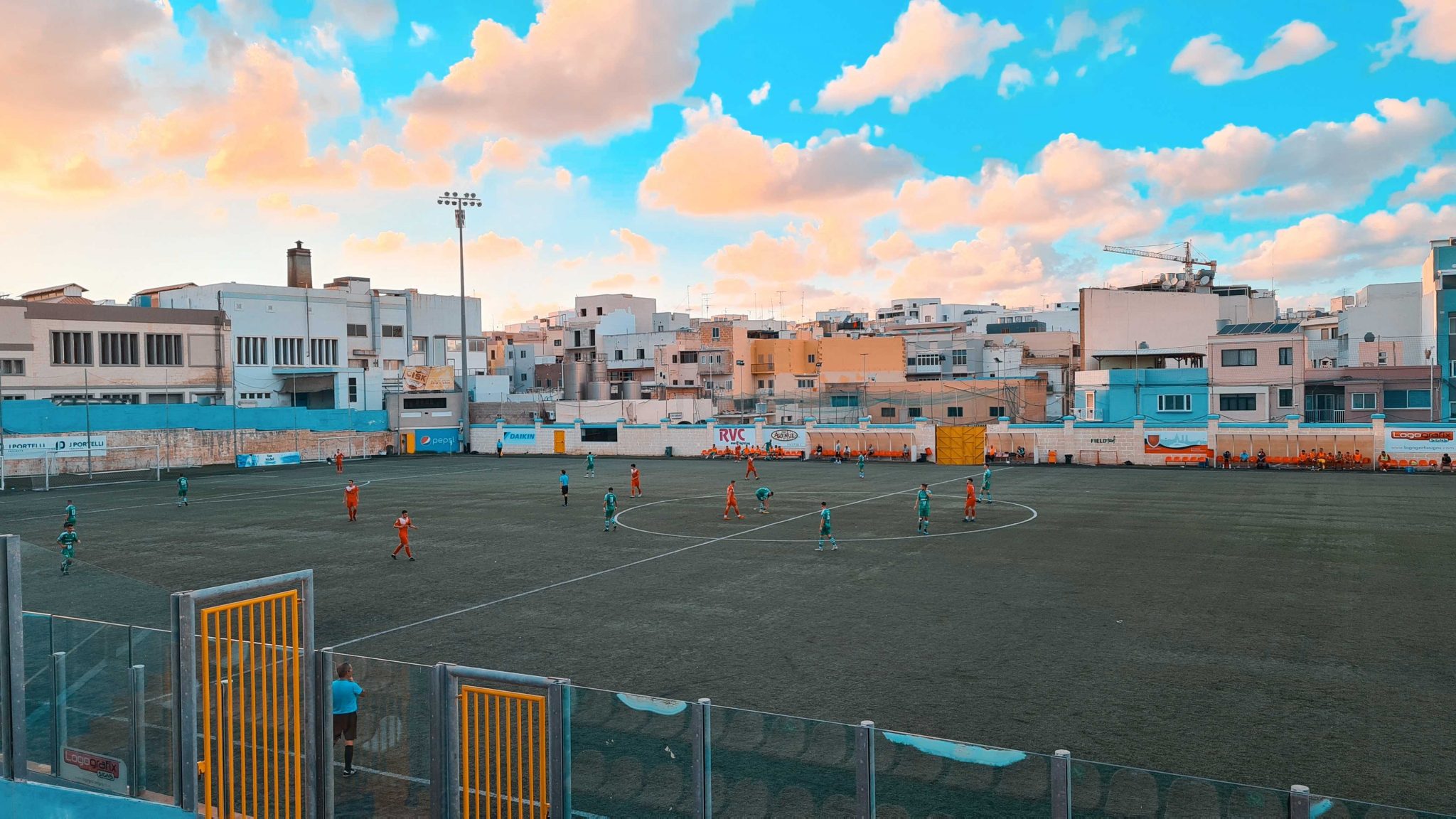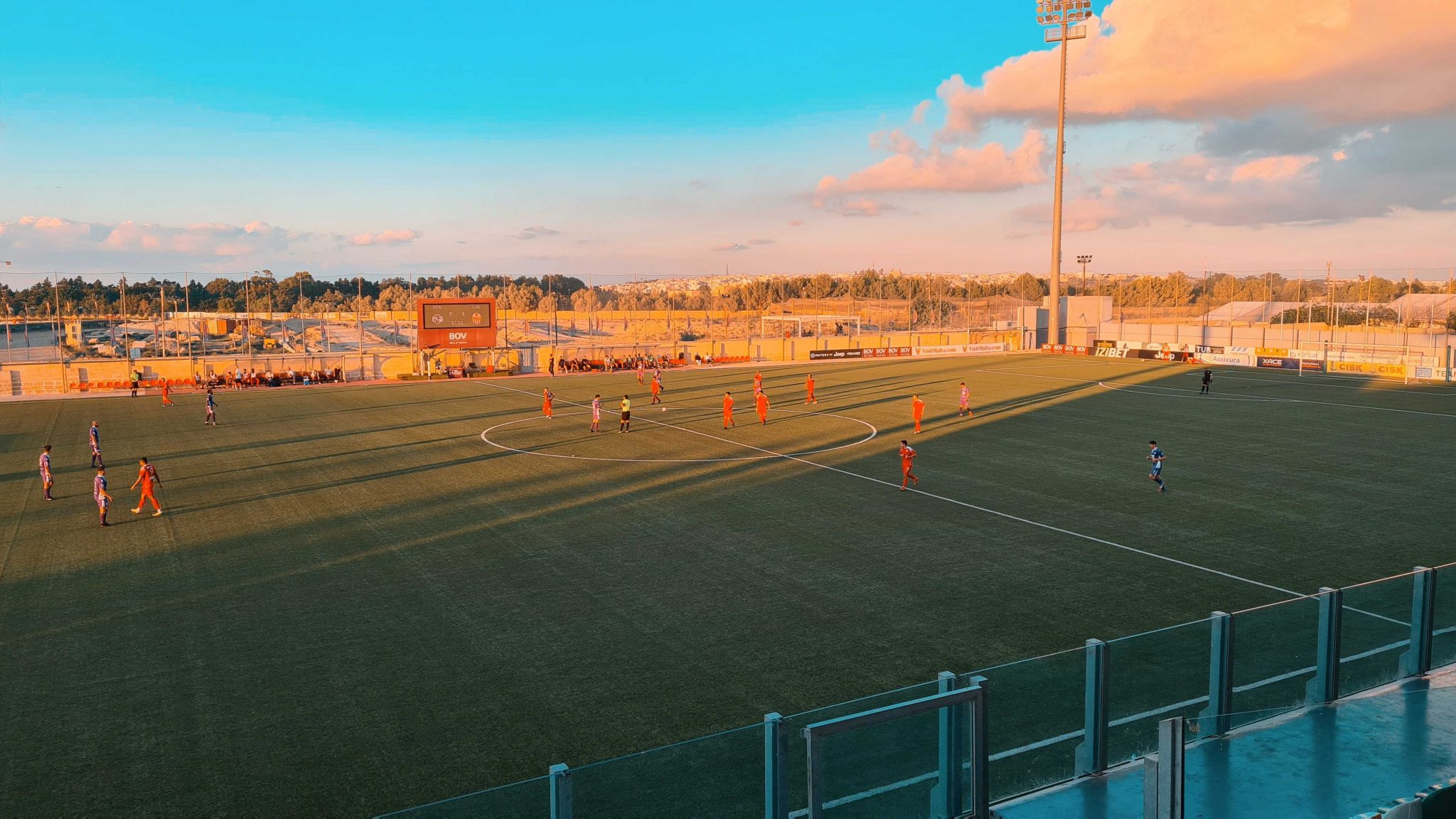 Das Nationalstadion Maltas steht in Ta‘ Qali, einem Gebiet mitten auf der Insel, der neben zweier Stadien und weiteren Sportanlagen auch mehrere Parks, Grünflächen und sogar eine Weinbaufläche beherbergt. Zur Zeit finden hier fast alle Spiele der ersten Liga statt, jeweils zwei am Samstag und Sonntag. Das führt dazu, dass sich während der zweiten Halbzeit des ersten Spiels bereits die Zuschauer der nächsten Partie auf der gegenüberliegenden Tribüne breit machen und Banner aufgehangen werden. Die Fans der Hamrum Spartans, Meister von 2021, machen ordentlich Radau. Mitten im Fanblock findet eine Blaskapelle Platz, die die Gesänge mit Trommeln, Saxophon und Trompete begleitet. Grund zum Feiern gibt es auch, denn das 0:1 durch Dodo (bürgerlich Ailton Jorge dos Santos Soares) in der 20. Minute wird nicht mehr hergegeben.